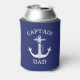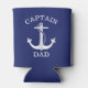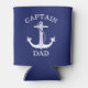 "Captain Dad" reads the text on this nautical can cooler featuring a white anchor with rope on a navy blue background. Perfect gift for sea loving dads on Father's Day, birthdays and other special occasions.