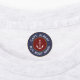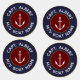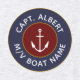 Personalised Captain with your name and boat name nautical anchor logo iron on labels. Navy blue and maroon classic circle emblem with white anchor and text and gold boarders.