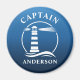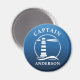 Stylish round refrigerator magnet with Captain or other title, your personalized name and a custom classic lighthouse with ocean waves in white on shades of sea blue or choose background colors to match your decor. Makes a great unique gift.