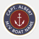Personalised captain with your name and boat name nautical anchor logo round stickers. Classic navy blue and maroon round emblem with white anchor, text and gold boarders on a white background.
