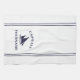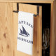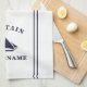 Captain with your name personalized nautical sailboat kitchen towel. White with navy blue text.