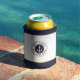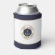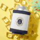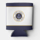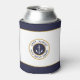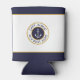 Personalised captain with your name and boat name nautical anchor logo can cooler. Classic circle emblem with anchor and text fields in navy blue, white and gold on a white background.