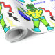 Space cartoon characters alien robot Captain Zacky and Zippie Spaceship. Colourful, fun Robot Space Happy Birthday. Green Robot with green and yellow outfit and light blue space boots. Zippie the Spaceship is blue and green and looks like a blue fish with his blue eyes, nose and smiling mouth. Click CUSTOMIZE IT to add YOUR NAME underneath spaceship, if you wish. Original Artwork © 2014 TamiraZDesigns.