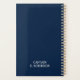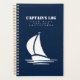 Captain's Log custom spiral planner for sailor. Personalised weekly / monthly agenda book. Unique Christmas or Birthday gift idea for friends, family, husband, dad, uncle, grandpa, skipper, boat captain, fisher, boss etc. Add your own personalised name, company name, business slogan, quote or monogram initials. Upload your own photo on the back or front optionally. Customisable office and school supplies. Sailboat silhouette design on the lake or ocean water. Handy for planning work, sailing trips, boating days, chores, jobs, appointments and more. Navy blue and white colour combo.