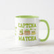 Fun CAPTCHA DA MATCHA Fun Latte Drinker Mug with CUSTOMIZABLE TEXT, for drinkers of matcha latte tea. The design shows three images of matcha latte coffee and leaves in between bold green text reading CAPTCHA DA MATCHA. The text in the middle is CUSTOMIZABLE so you can PERSONALIZE with your own wording or delete.