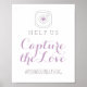 Stylish custom wedding # hashtag sign invites guests share photos of the big day with a specific # hashtag. Design features lavender purple and pewter grey wording and Instagram logo with heart.