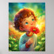 In the image, a cheerful child is gently holding a vibrant red flower close to their nose. With a bright smile on their face, the child closes their eyes, savouring the sweet fragrance. The sun shines down, casting a warm glow on the scene, and the background is filled with soft, blurred greens and colours, emphasising the beauty of the moment. The child's expression radiates pure joy and curiosity, capturing the simple pleasure of experiencing nature.