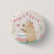 This whimsical illustration features a cheerful capybara celebrating a birthday in style. The capybara, adorned with a playful party hat topped with candles, joyfully holds a slice of cake. The scene is completed with a beautifully decorated two-tiered birthday cake, featuring pastel hues of pink, blue, and white, topped with vibrant candles. The festive backdrop includes pink and blue butterflies, floral patterns, and a string of colourful pennant banners, adding to the joyous ambiance. Perfect for birthday celebrations, party invitations, or themed merchandise, this charming design exudes fun and festivity.