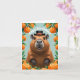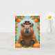 This charming card features a smiling cartoon capybara wearing a stylish black hat, surrounded by a cheerful border of bright oranges. The fresh, colorful design is perfect for animal lovers and fruit fans alike. Whether you’re celebrating a friend, family member, or coworker, this playful card will make their special day extra sweet.