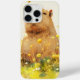 A joyful capybara is surrounded by a field of yellow flowers, smiling contentedly while a small butterfly hovers above its head. The light and pastel colours give the scene a warm and peaceful atmosphere.