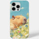 A large, relaxed capybara rests peacefully among a vibrant patch of flowers under a bright blue sky with fluffy clouds. The surrounding foliage and flora create a tranquil and serene atmosphere.