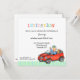children's invitations This boy's birthday party invite has a boy driving in a red toy car on it. His cute dog is riding along in the back. The bottom has a green and blue striped border. You can easily customise your party information in the middle. Ans Collijn©