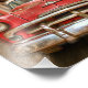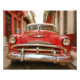 Classic American car in Havana, Cuba with appearance of speeding in the narrow street surrounded by matching color buildings around the car (red and white).