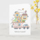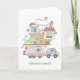 Somewhat haphazardly enhanced 3-story high family trailer is towed by a small car. There is a small vegetable garden on the roof, complete with a scarecrow. An open bathtub on the second floor. A garbage can at the back of the trailer. Some laundry is drying on the wind. Various family pets include a dog, a cat, a chicken, and even some goldfish. A small boy is waving from the trailer window.