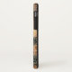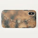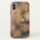 The original collage artwork by ZoeSPEAK on this iPhone X case is reminiscent of tortoise shell and leather, in shades of brown from caramel cream to dark chocolate. The case is designed in the style of a clutch bag or purse, with a top flap of smooth shapes looking almost like clouds. Its curved edge is highlighted by gold beads and a thin golden border. The pattern continues over the rest of the case, but with a texture of lines like crackled glass over the cloud shapes. There is a flap closure in the centre, a round disc made of the crackled ice pattern, with a thin golden border. Over this there is a gold sphere with a monogram in black. This is set to personalise, or delete if you wish.