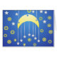 This design features a moon mobile with stars hanging from it.. The background is blue, as in the night sky. Stars and circles surround it. You can customise this card with your own text or saying by selecting "customise." It makes a wonderful baby shower invitation, baby announcement., congratulations card or greeting card.
