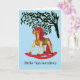 Photo image of wooden rocking horse, with red mane and rockers, sitting under branches of tree. "Ride 'Em Cowboy" on front, and "Happy Birthday" inside may be changed.
