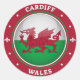 A 3D depiction of the Welsh national flag, sits in the middle of the design The capital city, Cardiff, is at the top of the image, and the country, Wales, is at the bottom of the image. In between the two pieces of text are decorative stars and two fleur-de-lis.