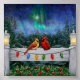 Northern Red Cardinals perch on a white fence strung with Christmas lights. Snowflakes falls from the night sky, covering the surrounding forest with a winter blanket of white.