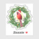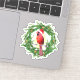 A holiday wreath with a Cardinal wearing a Santa hat.