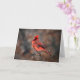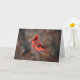 A male cardinal waits his turn at a bird feeder on a snowy day.