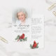 This comforting memorial sympathy card features a softly faded photo paired with elegant script typography and a vibrant red cardinal perched on evergreen branches. Often viewed as a symbol of hope and remembrance, the cardinal adds warmth and meaning to this design. The back shares a heartfelt message of love and reflection, making this card a thoughtful keepsake for a funeral, memorial service or Celebration of Life as family and friends honor a life that will never be forgotten. Its small and portable size of 3.5x2" (wallet-sized) makes it convenient for loved ones to carry it with them as a reminder of your loved one’s life and spirit. Personalization makes each card unique.