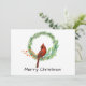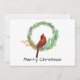 This sweet holiday design is clean and fresh. Set on a white background, this delicate evergreen wreathe is decorated with eucalyptus and red berries. At the bottom of the wreath there's a red cardinal. On the back of the card there is a text box that allows you to add your own holiday message. If you prefer, you can delete the box and write your message.