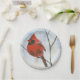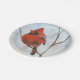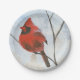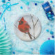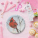 A tiny watercolor wildlife painting of a brilliant, male Cardinal bird with his feathers puffed up to keep warm on a cold winter day.