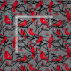 Beautiful grey fabric patterned with hand drawn red cardinal birds on woodland tree branches, with red winter berries