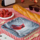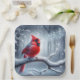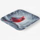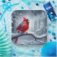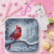 A red cardinal bird singing on a winter tree branch singing with musical notes