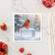 A vibrant red cardinal perches on a transparent ice block surrounded by snowflakes gently falling against a blurred winter backdrop.