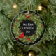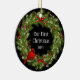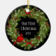 This ceramic ornament is shown with a festive Christmas holiday berry wreath and cardinal bird print.