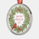 This ornament is shown with a festive Christmas holiday berry wreath and cardinal bird print.