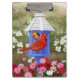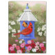 A beautifully painted scene of red cardinals making their home in a bright blue birdhouse surrounded by a garden blooming with dogwood and colourful pink, red, and white cosmos flowers. Realistic artwork created from a painting by wildlife artist Crista S. Forest.