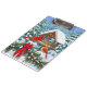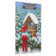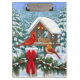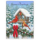 A pair of Northern Red Cardinals perch on a snow-covered white picket fence adorned with Christmas garland and a bright red bow. They feast at a winter bird feeder decorated with Christmas bells, ribbon, and holly. Realistic Artwork created by wildlife artist Crista S. Forest.