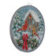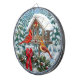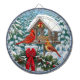 A pair of Northern Red Cardinals perch on a snow-covered white picket fence adorned with Christmas garland and a bright red bow. They feast at a winter bird feeder decorated with Christmas bells, ribbon, and holly. Realistic Artwork created by wildlife artist Crista S. Forest.