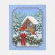 A pair of Northern Red Cardinals perch on a snow-covered white picket fence adorned with Christmas garland and a bright red bow. They feast at a winter bird feeder decorated with Christmas bells, ribbon, and holly. Realistic Artwork created by wildlife artist Crista S. Forest.