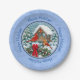 A pair of Northern Red Cardinals perch on a snow-covered white picket fence adorned with Christmas garland and a bright red bow. They feast at a winter bird feeder decorated with Christmas bells, ribbon, and holly. Realistic Artwork created by wildlife artist Crista S. Forest.