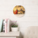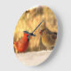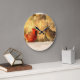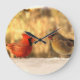 Here is a wall clock featuring Mr. and Mrs. Northern Cardinal. It is autumn with glorious foliage in the background but the first snow has fallen to give us a preview of winter. He is a brilliant red colour. She is orange, gold and brown. Both have crests and orange beaks. They are truly the royalty of backyard birds with their distinctive song and lovely colours.