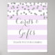 Cards and gifts sign poster for baby shower, bridal shower, or wedding in light purple lavender and white stripes pattern with silver glitter effect confetti, please note silver is photographic effect only. Perfect for a baby shower, wedding, or bridal shower.