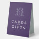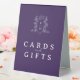 Cards and gift table sign in a deep rich purple, silver and white. Use for your gift table so guests know where to place cards and gifts. Personalise with your own words (or use ours) and add your own monogram initials in the monogram crown design at the top. Other items are available. Original hand drawn crown and vines heraldry style monogram drawing and design by Sarah Trett for www.mylittleedenweddings.com