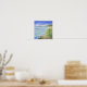 Pretty tropical beach scene with a boat and a palm tree, on this art print.