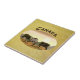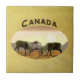 Two caribou bulls wrestle during the fall rut in the far north while the sun sets in the background. Text reading "Canada" also appears. The image is superimposed on a braintan leather background.