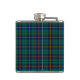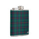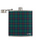 Monogrammed flask with the family tartan of Clan Carmichael, a traditional Scottish plaid pattern in forest green and dark royal blue with black, red, and yellow gold accents.