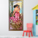 She is standing in a garden looking partly back at the viewer, with a rich assortment of flowers about her and a large leafless tree to her right.