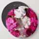 A pretty button with a posy of pink and white border carnations, part of a photograph by Judy Adamson.