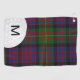 Colourful golf towel done in the classic Scottish clan Carnegie tartan plaid pattern. Graphics of a large golf ball peeks out of the bottom left corner with a black one letter monogram ready to personalise.