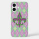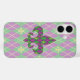 A harlequin pattern of green and purple is transformed into a playful argyle with an overlay of gold diamond outlines and fleur de lis, creating a fun and colourful pattern perfect for any New Orleans influenced Mardi Gras celebration. The pattern is masked behind the silhouette of a fleur de lis to add a fun final note.
