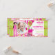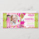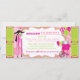 Stilt walkers, cotton candy, and balloons carnival theme birthday card with photo insert in pinks, hot pink, white, and kiwi green with raffle tickets at side. Just perforate the sides for an easy tear off!