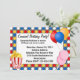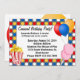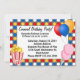 Exciting and youthful birthday party invitation features popcorn, fluffy pink cotton candy, and red yellow and blue balloons, with bright primary colord polka dot lights in the background. Customise with your party info. Makes a great, unique party invitation for the birthday boy, girl, or any occasion! Fun design with information about the party.